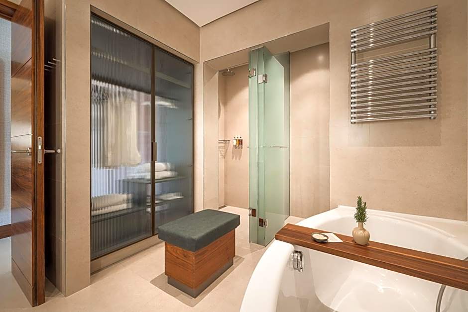 Rooms enjoying the most stunning views of the sea are located on the upper floors of the hotel. The inviting atmosphere created by warm colors and natural materials is paired with modern amenities, such as a bathroom with a double sink, a bathtub, a separate walk-in shower, and luxury cosmetics.