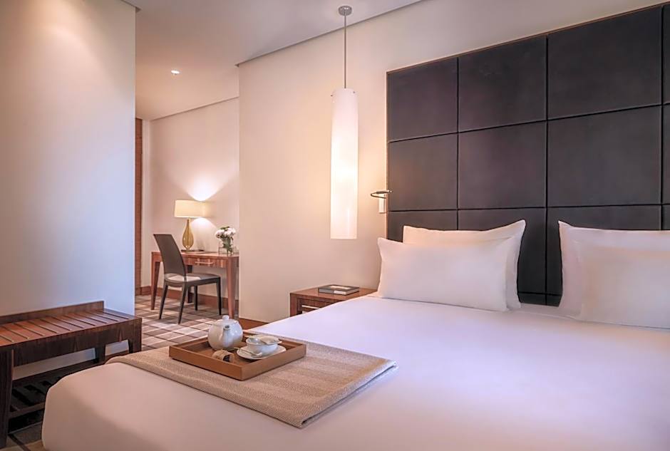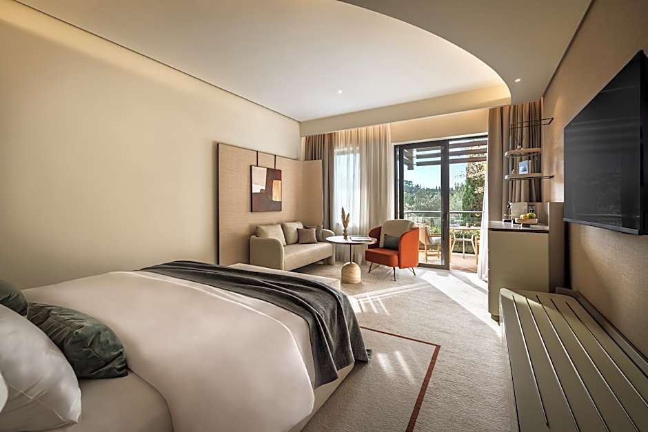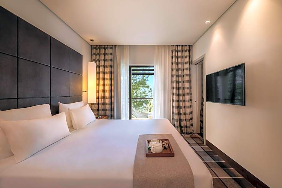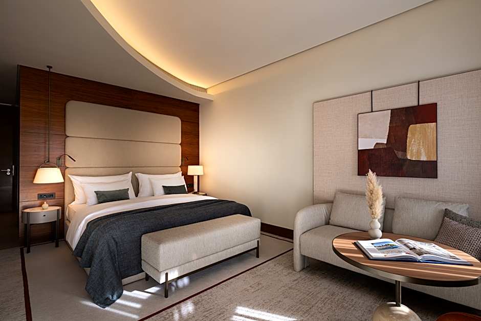 The room features a king-sized bed or two connected twin beds and is inspired by the understated pleasure of the Mediterranean felt everywhere in the hotel – in earth tones, natural materials, and Mediterranean plants on the balcony. The balcony overlooks the green parks surrounding the hotel. The rooms are adapted to people with disabilities.